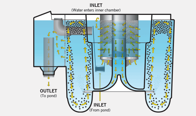 The mechanically clean water then passes to the outside chamber of the Nexus+ where the new K+Media Moving Bed is located for biological treatment prior to being returned to the pond. At this stage, biological breakdown occurs through different strains of bacteria and filter feeders living on the vast protected surface area of each piece of the K+Media. These bacteria convert Ammonia and Nitrite into less harmful Nitrate. Water then passes through the exit grill into the outlet, returning back to the pond.